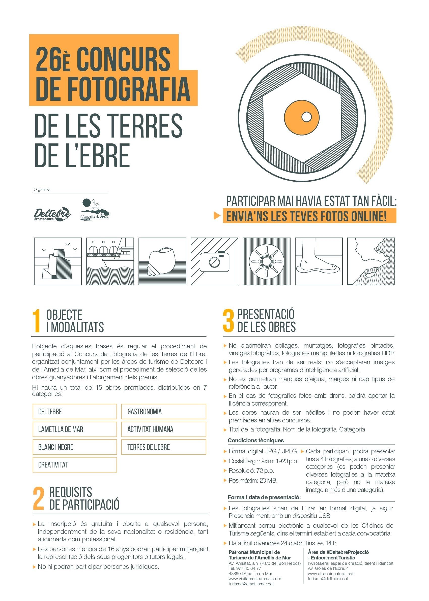 CONCURS DE FOTOGRAFIA DE LES TERRES DE L’EBRE 1.- Objecte i modalitats L’objecte d’aquestes bases és regular el procediment de participació al Concurs de Fotografia de les Terres de l’Ebre, organitzat conjuntament per les àrees de turisme de Deltebre i de l’Ametlla de Mar, així com el procediment de selecció de les obres guanyadores i l’atorgament dels premis. Hi haurà un total de 15 obres premiades, distribuïdes en 7 categories: • Deltebre • L’Ametlla de Mar • Blanc i Negre • Creativitat • Gastronomia • Activitat Humana • Terres de l’Ebre